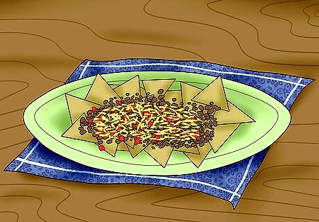 Make fried pasta nachos. Lasagna noodles can easily be made into a nacho dish for the whole family to enjoy. Start by boiling and straining your lasagna noodles before cutting them into triangles the size of tortilla chips. Afterwards, deep fry your noodles and then place them in a baking dish. Finish by Mixing ground beef with pre-packaged taco seasoning and sprinkle your mixture onto the top of your chips. Sprinkling your choice of cheese over the ground beef and chips. Placing the dish in the oven and baking it at 250 degrees Fahrenheit (121 degrees Celsius) until the cheese has melted.