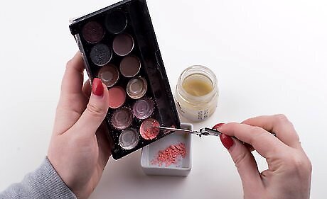 Create custom lip gloss shades. If you need a certain shade of lip gloss that you can’t find at the store, use petroleum jelly to create a custom gloss. Mix a small amount of the petroleum jelly with loose powdered eye shadow or blush in the shade you want. Apply the mixture to your lips with a brush for a pretty, glossy lip color. Add as much or as little of the eye shadow or blush pigment to create the shade that you want. The more pigment that you add, the more concentrated the gloss shade will be. If you don’t have loose eye shadows or blushes, scrape a little powder from a pressed version to mix with the petroleum jelly. You can also use powdered drink mixes, such as Kool Aid, to color the petroleum jelly. Not only will the mix color the jelly, but it will also flavor it as well. For example, make a cherry-colored and flavored gloss with Cherry Kool Aid.