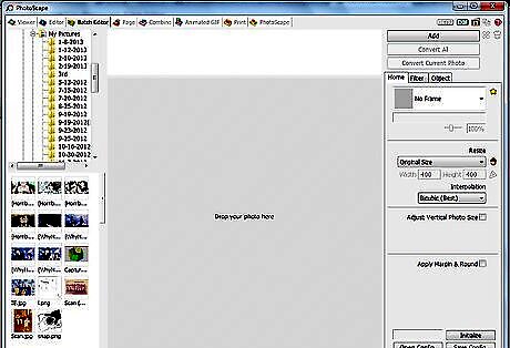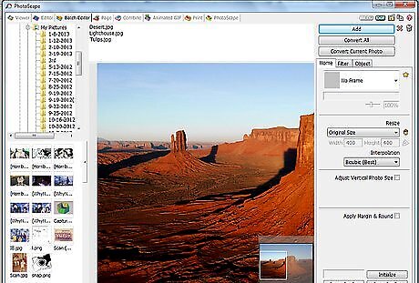 Start processing. Some of the things that you can do are Resizing, Converting, etc. To resize, click on the files that you want to resize and watch them appear in the top, middle window. (Alternatively, you can drag the photos there). Experiment with what serves your purpose. You might want them a certain size for thumbnails, or for uploading somewhere.Use Photoscape Batch Editor Step 5Bullet1.jpg Once you have selected how you want to resize the photos, click on to convert the files.Use Photoscape Batch Editor Step 5Bullet2.jpg Change the destination folder. If you want the files in a particular place, click on the button.Use Photoscape Batch Editor Step 5Bullet3.jpg Resize the photos.Use Photoscape Batch Editor Step 5Bullet4.jpg Add a frame. You can also add a frame. Photoscape has a wide selection of frames or borders to choose from. You can actually resize the photos, add the border or borders (depending on if you put different frames on different pictures), and anything else that you choose to do, all at once.Use Photoscape Batch Editor Step 5Bullet5.jpg