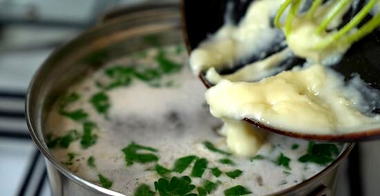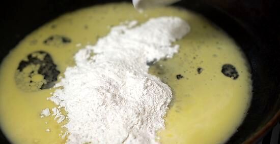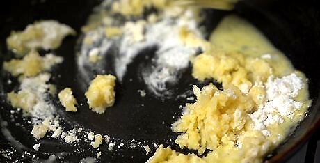 Mix both ingredients together for 6 minutes to make a blond roux. Continue slowly stirring the flour and butter together until the roux forms an even, creamy consistency. Once the mixture is golden-brown, remove it from the stovetop. You can use your blond roux to thicken a variety of soups, chowders, and sauces.