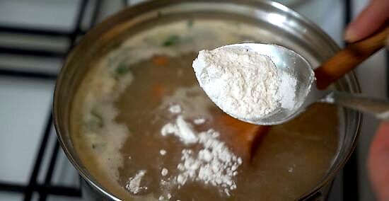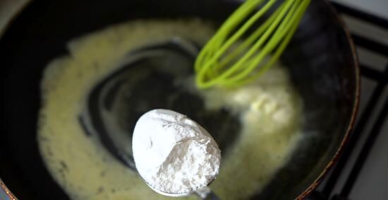 Whisk a large amount of rice flour into the mixture. Add 10 tbsp (100 g) of flour into the skillet in gradual amounts, using a whisk to stir the rice flour into the melted butter. Continue mixing until the butter and flour create a smooth, sandy consistency. This mixture works especially well in creamy dishes, like creamy potato soup. These measurements work best for a family-sized, 12-serving dish. For a smaller, 6-serving dish, use 5 tbsp (50 g) of flour instead.