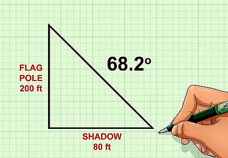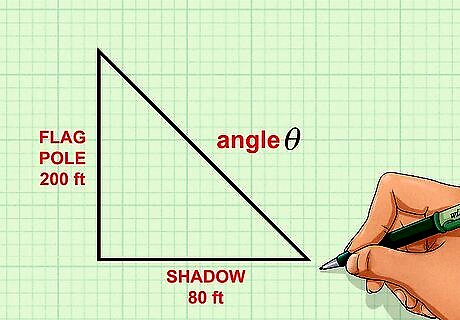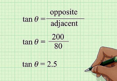 Set up a trigonometry equation. You need to review which parts of the triangle you know and which you need to solve. This will help you choose the correct trigonometry function to help find the unknown value. For the flag pole, you know the vertical height and the horizontal base, but you do not know the hypotenuse. The function that uses the ratio of the two legs is the tangent. Set up a tangent equation as follows: tan θ = opposite adjacent {\displaystyle \tan \theta ={\frac {\text{opposite}}{\text{adjacent}}}} \tan \theta ={\frac {{\text{opposite}}}{{\text{adjacent}}}} tan θ = 200 80 {\displaystyle \tan \theta ={\frac {200}{80}}} \tan \theta ={\frac {200}{80}} tan θ = 2.5 {\displaystyle \tan \theta =2.5} \tan \theta =2.5