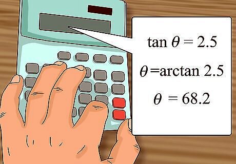 Use the inverse trigonometry function to solve the angle measurement. When you need to find the measure of the angle itself, you will need to use what is called the inverse trigonometry function. The inverse functions are referred to as “arc” functions. These are arcsin, arccos, and arctan. On a calculator, these functions appear as s i n − 1 {\displaystyle sin^{-1}} sin^{{-1}}, c o s − 1 {\displaystyle cos^{-1}} cos^{{-1}} and t a n − 1 {\displaystyle tan^{-1}} tan^{{-1}}. You will enter the value and then press the appropriate button, and you will get the measure of the angle. Some calculators differ. On some, you will enter the value first, and then the arctan button. On some, you enter the arctan and then the value. You will need to determine which process works for your calculator. tan θ = 2.5 {\displaystyle \tan \theta =2.5} \tan \theta =2.5 θ = arctan 2.5 {\displaystyle \theta =\arctan 2.5} \theta =\arctan 2.5 θ = 68.2 {\displaystyle \theta =68.2} \theta =68.2