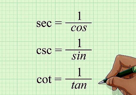 Review the other ratios. Occasionally, you may need alternate ratios than the cosine, sine and tangent. These alternative functions are inverses of the first three. They are less commonly used in basic calculations. However, in more advanced trigonometric work, they become essential. These functions are: Secant. This is abbreviated as “sec” and is equal to 1 c o s {\displaystyle {\frac {1}{cos}}} {\frac {1}{cos}}. Cosecant. The cosecant is abbreviated as “csc” and is equal to 1 s i n {\displaystyle {\frac {1}{sin}}} {\frac {1}{sin}}. Cotangent. The cotangent is abbreviated as “cot” and is equal to 1 t a n {\displaystyle {\frac {1}{tan}}} {\frac {1}{tan}}.