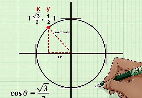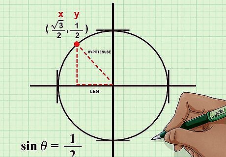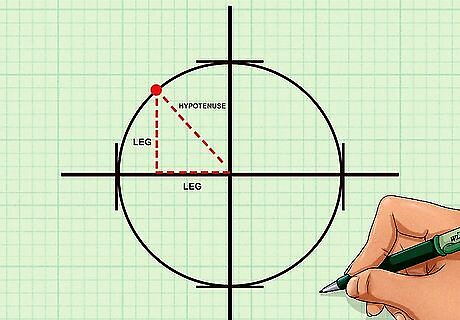 Understand the unit circle. Trigonometry is based on the mathematical concept of the unit circle. This is a circle drawn on the x-y coordinate plane, with its center at (0,0), with a radius of 1. By setting the radius equal to 1, the trigonometric functions can be measured directly. If you envision a unit circle, any point on that circle establishes a right triangle. From a selected point on the circle, draw a vertical line directly to the x-axis. Then from that point on the x-axis, draw a horizontal line connecting to the origin. These two lines, the vertical and the horizontal, serve as the legs of a right triangle. The radius of the circle that connects the point on the circle to the center at the origin is the hypotenuse of the right triangle. Trigonometric functions still apply to triangles and lengths other than 1, but setting the radius equal to 1 makes calculating the ratios more direct.