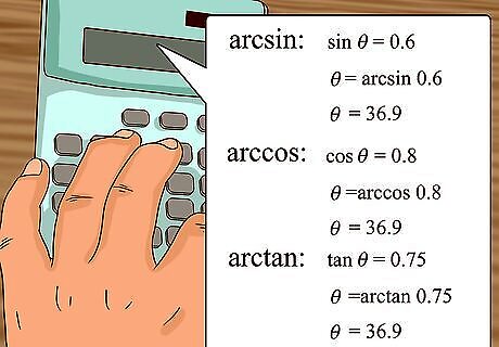 Use a calculator or trigonometry table to find the arc-function values to solve the measure of the angle. Find the measure using arcsin {\displaystyle \arcsin } \arcsin : sin θ = 0.6 {\displaystyle \sin \theta =0.6} \sin \theta =0.6 θ = arcsin 0.6 {\displaystyle \theta =\arcsin 0.6} \theta =\arcsin 0.6 θ = 36.9 {\displaystyle \theta =36.9} \theta =36.9 Find the measure using arccos {\displaystyle \arccos } \arccos : cos θ = 0.8 {\displaystyle \cos \theta =0.8} \cos \theta =0.8 θ = arccos 0.8 {\displaystyle \theta =\arccos 0.8} \theta =\arccos 0.8 θ = 36.9 {\displaystyle \theta =36.9} \theta =36.9 Find the measure using arctan {\displaystyle \arctan } \arctan : tan θ = 0.75 {\displaystyle \tan \theta =0.75} \tan \theta =0.75 θ = arctan 0.75 {\displaystyle \theta =\arctan 0.75} \theta =\arctan 0.75 θ = 36.9 {\displaystyle \theta =36.9} \theta =36.9