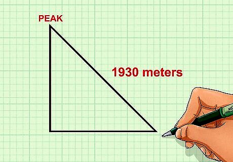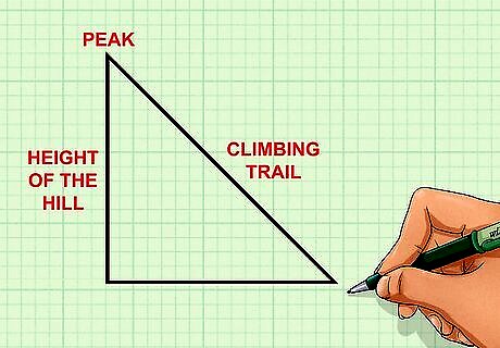 Set up a right triangle model. Trigonometry functions can be used to model real world situations involving lengths and angles. The first step is to define the situation with a right triangle model. For example, suppose you have the following problem: You are climbing a hill. You know that the peak of the hill is 500 meters above the base, and you know that the angle of the climb is 15 degrees. How far must you walk to reach the top? Sketch a right triangle and label the parts. The vertical leg is the height of the hill. The top of that leg represents the peak of the hill. The angled side of the triangle, the hypotenuse, is the climbing trail.