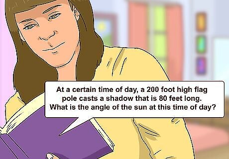 Read the problem with the unknown angle. Trigonometry can also be used to calculate angle measurements. The procedure is similar, but the problem will ask for the measurement of an unknown angle. Consider the following problem: At a certain time of day, a 200 foot high flag pole casts a shadow that is 80 feet long. What is the angle of the sun at this time of day?