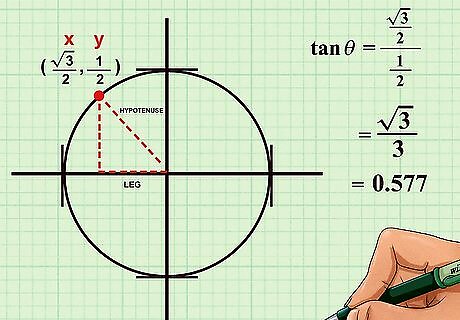 Understand the tangent function. The third common trigonometric function is the tangent. The tangent is the ratio of the two legs of the right triangle to each other, without reference to they hypotenuse. Specifically, for a chosen angle of a right triangle, the tangent is found by dividing the length of the leg opposite to the chosen angle over the leg adjacent to the chosen angle. On the unit circle, the tangent is equal to the y-coordinate divided by the x-coordinate. The tangent function is often abbreviated as “tan.” For a selected angle θ {\displaystyle \theta } \theta , you say you are measuring tan θ {\displaystyle \tan \theta } \tan \theta or tan ( θ ) {\displaystyle \tan(\theta )} \tan(\theta ). For the example of an angle θ {\displaystyle \theta } \theta of 30 degrees at the center of the unit circle, recall that the coordinates are ( 3 2 , 1 2 ) {\displaystyle ({\frac {\sqrt {3}}{2}},{\frac {1}{2}})} ({\frac {{\sqrt {3}}}{2}},{\frac {1}{2}}). You can find the tangent by dividing the sine (y-coordinate) by the cosine (x-coordinate) as follows: tan θ = 1 2 3 2 = 3 3 = 0.577 {\displaystyle \tan \theta ={\frac {\frac {1}{2}}{\frac {\sqrt {3}}{2}}}={\frac {\sqrt {3}}{3}}=0.577} \tan \theta ={\frac {{\frac {1}{2}}}{{\frac {{\sqrt {3}}}{2}}}}={\frac {{\sqrt {3}}}{3}}=0.577. Note that reporting the result in terms of a fraction with the square root, such as 3 3 {\displaystyle {\frac {\sqrt {3}}{3}}} {\frac {{\sqrt {3}}}{3}} is generally considered more precise and more accurate than rounding to a decimal like 0.577. For practically purposes, a three-place decimal may be acceptable.