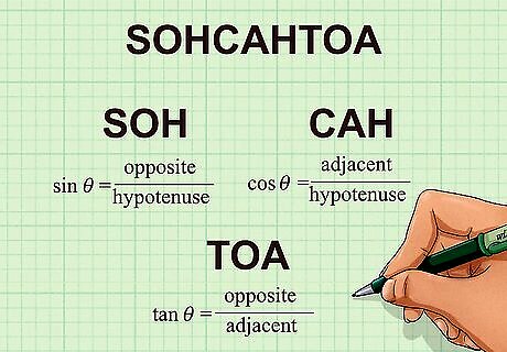 Learn the mnemonic device SOHCAHTOA. When trying to remember the ratios of the primary functions sin, cos and tan, many students use the memory tool “SOHCAHTOA.” When broken into its parts, it provides the ratios as follows: SOH stands for the initials of sin, opposite, hypotenuse, and calls to mind the ratio: sin = opposite hypotenuse {\displaystyle \sin ={\frac {\text{opposite}}{\text{hypotenuse}}}} \sin ={\frac {{\text{opposite}}}{{\text{hypotenuse}}}} CAH stands for the initials of cos, adjacent, hypotenuse, as follows: cos = adjacent hypotenuse {\displaystyle \cos ={\frac {\text{adjacent}}{\text{hypotenuse}}}} \cos ={\frac {{\text{adjacent}}}{{\text{hypotenuse}}}} TOA stands for the initials of tan, opposite, adjacent, and represents the ratio: tan = opposite adjacent {\displaystyle \tan ={\frac {\text{opposite}}{\text{adjacent}}}} \tan ={\frac {{\text{opposite}}}{{\text{adjacent}}}}
