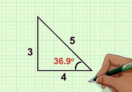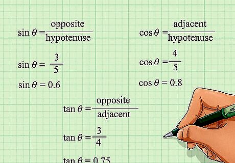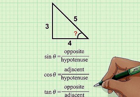 Insert the known values and solve for the unknown angle. In this case, continue solving using all three functions to see, eventually, that the three different functions all reach the same conclusion for the value of the angle θ {\displaystyle \theta } \theta . First set up a solution with the sin {\displaystyle \sin } \sin function: sin θ = opposite hypotenuse {\displaystyle \sin \theta ={\frac {\text{opposite}}{\text{hypotenuse}}}} \sin \theta ={\frac {{\text{opposite}}}{{\text{hypotenuse}}}} sin θ = 3 5 {\displaystyle \sin \theta ={\frac {3}{5}}} \sin \theta ={\frac {3}{5}} sin θ = 0.6 {\displaystyle \sin \theta =0.6} \sin \theta =0.6 Next, set up a solution with the cos {\displaystyle \cos } \cos function: cos θ = adjacent hypotenuse {\displaystyle \cos \theta ={\frac {\text{adjacent}}{\text{hypotenuse}}}} \cos \theta ={\frac {{\text{adjacent}}}{{\text{hypotenuse}}}} cos θ = 4 5 {\displaystyle \cos \theta ={\frac {4}{5}}} \cos \theta ={\frac {4}{5}} cos θ = 0.8 {\displaystyle \cos \theta =0.8} \cos \theta =0.8 Finally, set up a solution with the tan {\displaystyle \tan } \tan function: tan θ = opposite adjacent {\displaystyle \tan \theta ={\frac {\text{opposite}}{\text{adjacent}}}} \tan \theta ={\frac {{\text{opposite}}}{{\text{adjacent}}}} tan θ = 3 4 {\displaystyle \tan \theta ={\frac {3}{4}}} \tan \theta ={\frac {3}{4}} tan θ = 0.75 {\displaystyle \tan \theta =0.75} \tan \theta =0.75