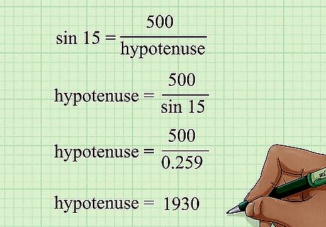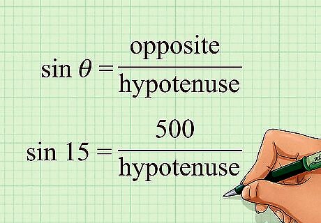 Set up a trigonometry equation. Review the information that you know and what you are trying to learn, and choose the trigonometry function that links those together. For example, the sine function links an angle, its opposite side and the hypotenuse. The cosine function links an angle, its adjacent side and the hypotenuse. The tangent function links the two legs without the hypotenuse. In the problem with the hill climb, you should recognize that you know the base angle and the vertical height of the triangle, so this should let you know that you will be using the sine function. Set up the problem as follows: sin θ = opposite hypotenuse {\displaystyle \sin \theta ={\frac {\text{opposite}}{\text{hypotenuse}}}} \sin \theta ={\frac {{\text{opposite}}}{{\text{hypotenuse}}}} sin 15 = 500 hypotenuse {\displaystyle \sin 15={\frac {500}{\text{hypotenuse}}}} \sin 15={\frac {500}{{\text{hypotenuse}}}}