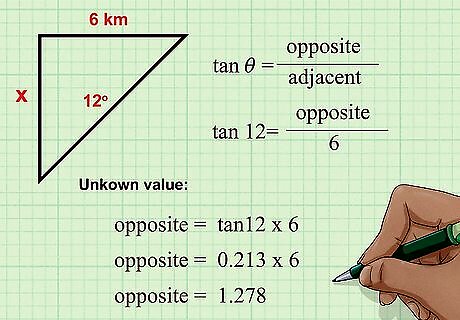 Solve another problem for practice. Consider one more problem, set up a diagram, and then solve for the unknown length. Read the problem. Suppose a coal bed under your property is at a 12 degree angle and comes to the surface 6 kilometers away. How deep do you have to dig straight down to reach the coal under your property? Set up a diagram. This problem actually sets up an inverted right triangle. The horizontal base represents the ground level. The vertical leg represents the depth under your property, and the hypotenuse is the 12 degree angle that slopes down to the coal bed. Label the known and unknown values. You know that the horizontal leg is 6 kilometers (3.7 mi), and the angle measurement is 12 degrees. You want to solve the length of the vertical leg. Set up a trigonometry equation. In this case, the unknown value that you want to solve is the vertical leg, and you know the horizontal leg. The trigonometry function that uses the two legs is the tangent. tan θ = opposite adjacent {\displaystyle \tan \theta ={\frac {\text{opposite}}{\text{adjacent}}}} \tan \theta ={\frac {{\text{opposite}}}{{\text{adjacent}}}} tan 12 = opposite 6 {\displaystyle \tan 12={\frac {\text{opposite}}{6}}} \tan 12={\frac {{\text{opposite}}}{6}} Solve for the unknown value. opposite = tan 12 ∗ 6 {\displaystyle {\text{opposite}}=\tan 12*6} {\text{opposite}}=\tan 12*6 opposite = 0.213 ∗ 6 {\displaystyle {\text{opposite}}=0.213*6} {\text{opposite}}=0.213*6 opposite = 1.278 {\displaystyle {\text{opposite}}=1.278} {\text{opposite}}=1.278 Interpret your result. The lengths in this problem are in units of kilometers. Therefore, your answer is 1.278 kilometers (0.794 mi). The answer to the question is that you must dig 1.278 kilometers (0.794 mi) straight down to reach the coal bed.