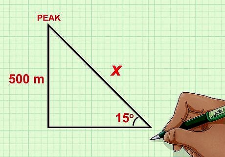 Identify the known parts of the triangle. When you have your sketch and have labeled the parts of it, you need to assign the values that you know. On the problem of the hill, you are told that the vertical height is 500 meters. Mark the vertical leg of the triangle 500 m. You are told that the climbing angle is 15 degrees. This is the angle between the base (bottom leg) of the triangle and the hypotenuse. You are asked to find the distance of the climb, which is the length of the hypotenuse of the triangle. Mark this unknown as x {\displaystyle x} x.