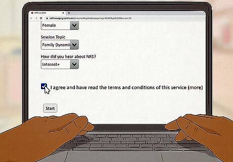 Fill out the information on the chat registration page. This page will ask for some information about yourself. Be sure to fill out all the information truthfully; don't worry, the information will never be used to harm you in any possible way. One part of the form tells you to select a screen name. If you don't feel comfortable giving out your real name, you can select any type of nickname you want! Another part tells you to select a session topic. Think back to the problems you are facing, and select the category that fits best. If none of the categories apply, select other.