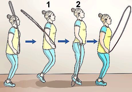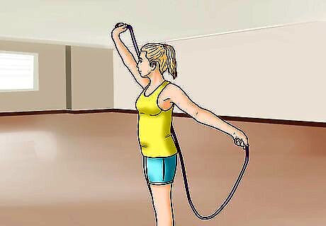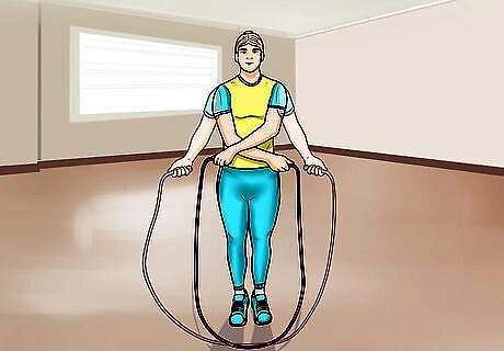 Crisscross your arms while jumping rope. You can keep them crisscrossed the whole time at the beginning, but move on to alternating between uncrossed and crossed when you can. Keep in mind that you do not have to be able to do this for very long; most routines consist of only a few jumps to show off your skills. Like before, move on to jumping backwards once you are comfortable, and you can do it while running in place both forwards and backwards, too.