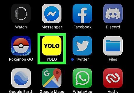 Open Yolo. This app icon is the word "Yolo" in black on a yellow background. You can find this app on your Home screen, in the app drawer, or by searching.