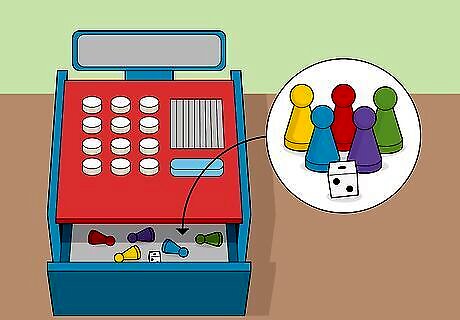 Keep game pieces inside a toy cash register or child’s jewelry box. If the original game box is missing or damaged, consider using an old toy cash register to hold game pieces and even the game board if its large enough.