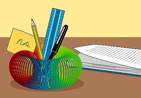 Contain office supplies inside a Slinky toy. Errant office supplies flooding your desk can be annoying. Contain pens, rulers and even notepads inside a Slinky toy. Simply wrap the Slinky into a circle on your desk, clip with a binder or paper clip and you have an automatic desk coral.