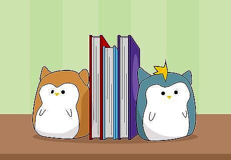 Prop large, hearty stuffed animals to become bookends. If books keep falling off the shelf, find the most bottom heavy stuffed animal that will fit on the shelf and make the toy do the job of a book end.