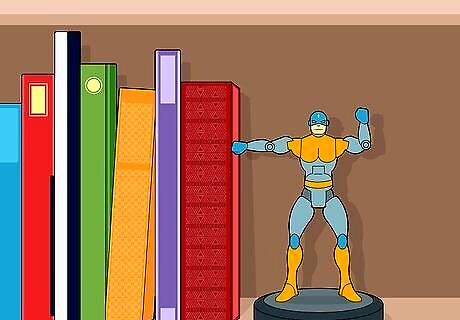 Create bookends using small, plastic action figures. Mount 10” to 12” hard, plastic action figures on the wall to hold caps and jackets in your child’s room. Drill holes in the figure’s feet and mount on the wall using screws.