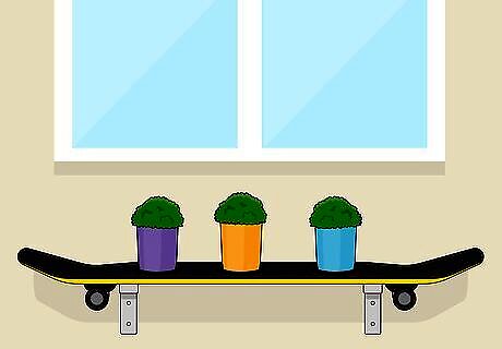 Use an old skateboard as a shelf. For the ultimate skater, mounting an old board on the wall not only acts as a handy shelf but will also be a proud way to show shred-worthy credibility. Boards can be mounted either by the trucks or through the board itself depending on how you plan to use the board (as a hook or a shelf).