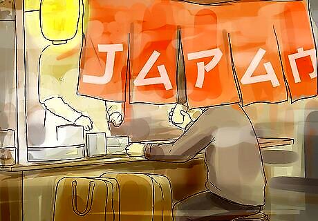 Stick to budget restaurants and bars when eating out. Japan offers plenty of budget food choices in restaurants, so you don't need to avoid eating out altogether. Décor is often a good indicator of price, so be alert. Tipping is not expected in Japan, so you can save even more by not doing so. It's a really good idea to have a menu-reading list on your smartphone or in your guidebook so that you know what you're eating and the value. And it pays to ask for meibutsu if you're a food lover––this is the word for "speciality" and will ensure that you get the most locally true cuisine possible. Noodle bars and night street stalls specializing in noodles (ramen) are often a great way to get very full at an affordable choice. You'll know a ramen restaurant when you see customers seated at a long counter eating from steaming bowls. Udon and soba dishes are another cheap way to eat in Japan provided you choose a cheap restaurant. Izakaya is the Japanese version of a pub-eatery, and you can get a selection of typical Japanese foods as well as Western foods as such places. It's casual food, and therefore usually fairly inexpensive. Yakitori is a skewer of vegetables and charcoal-grilled chicken. It's usually served with beer or sake after work and it might be enough for a meal in some places. There are yakitori restaurants (yakitori-ya), often found near train stations. Just be aware that prices are usually for one yakitori, so add up the costs if you want more. Although sushi is considered to be a snack, it is possible to fill up on sushi as a meal. Look for automatic sushi places, known as kaiten-sushi, that serve sushi on an automatic conveyor belt. The color code on the plates you choose are the price indicators and they should match with a price chart on the wall. Choose carefully and you might be able to fill up for very little cost. Look for places where the locals eat, although you'll need a grasp of basic Japanese as such places rarely have menus and if they do, rarely anything in English. Look for nomiya and aka-chochin Japanese restaurants or chuka-ryori-ya cheap Chinese restaurants.