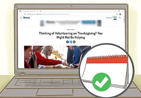 Volunteer at a local aid organization for a few hours. Some aid organizations may be holding Thanksgiving aid events, which could be anything from food and clothing drives to events for veterans or homeless people. Search online for charities in your area, then call or look on their website to see if they’re hosting any volunteering events on Thanksgiving. Possible Volunteer Locations The Salvation Army Rescue Mission Red Cross A local animal shelter A local church or place of worship