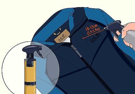 Take your jacket out and spray it with Apparel Proofer to waterproof it. Hold the bottle of Apparel Proofer 10 to 15 centimetres (3.9 to 5.9 in) away from your wet, clean jacket and spray a light coating of the product all over. Flip the jacket over to get both sides, then use a clean cloth to wipe the excess proofer off the jacket. Apparel Proofer is a Jack Wolfskin product that you can find on their website. It coats your jacket in a waterproof coating to make it resistant to rain and snow again. If you don’t have that, you can use a generic brand waterproofing spray from a sporting goods store. If your jacket is waterproof, you need to add proofer to it to make it waterproof again. If it isn’t waterproof to begin with, you don’t have to.