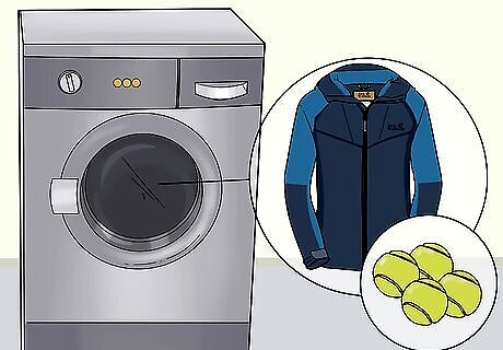 Add 3 to 4 tennis balls to your dryer if you are drying a down jacket. Down jackets are usually for super cold weather and have down feathers inside of them. Before you dry a down jacket, put 3 to 4 new, clean tennis balls into the dryer to break up the clumps of down as it dries.Tip: Down jackets may need to be dried for longer. You can put them in your dryer for up to 4 hours if you need to. If you don’t have tennis balls, take the jacket out of the dryer every hour to break up the clumps by hand. Down jackets are fully dry when you can’t feel any clumps of down on the inside.