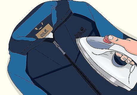 Iron the jacket until it’s dry if you can’t tumble dry it. Spread your jacket out on an ironing board and heat up your iron. Press the iron over the front and back of the jacket until there is no more Apparel Proofer left on the outside. Although it may seem strange to iron a wet jacket, it is safe to do so as long as you pass the iron quickly over the fabric. The Apparel Proofer product needs heat to adhere to the outside of your jacket. If you just let it air dry, it won’t get waterproof.