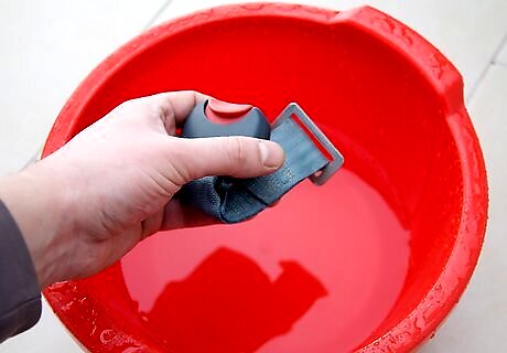 Dunk the buckle in warm water. Whether plastic or metal, the buckles should be able to hold up to more vigorous cleaning than the straps. However, they are still essential components that should face minimal wear and tear to ensure they work when it really counts. Simply dangle the buckle on the strap and dip it into a bucket of lukewarm water, then slosh it around a bit to loosen any gunk inside the mechanism. Clean the surface with a soft cloth and water (and mild soap if needed).