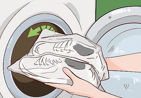 Wash your sneakers on occasion. Work out sneakers can actually be washed in a washing machine. Wipe off any caked on mud or dirt and remove the shoe laces before adding your sneakers to the wash. Place the sneakers in a pillow case and then tie it shut. Wash the sneakers with dark clothing to keep them from bouncing around too much. Used the coldest setting possible to wash your sneakers.