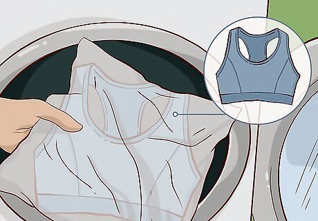 Be careful when washing sports bras. Sports bras can be washed in the laundry machine as long as you use a non-chlorine detergent. You can wash them in hot or cold water, but should always allow them to air dry. If you have a lingerie bag, place sports bras in this before throwing them in the wash. This will prevent them from snagging.