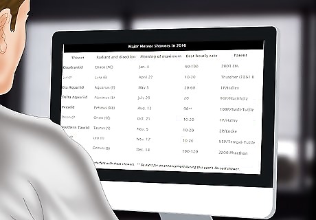 Research when and where meteor showers will be occurring. Both the time and the location of meteor showers are predictable. Look online for a meteor calendar to find out what meteor showers will be happening in your area in the near future. A meteor shower always appears from the same point in the sky, which is known as the "radiant". The meteor shower usually gets its name from the constellation that contains that radiant. Meteor showers happen year-round, with the month of November being the most active time. You can see a meteor in the night sky at any time, but if you want the best chance of seeing one (or many) plan your outing around a meteor calendar. The table above outlines the major meteor showers in the northern hemisphere region. Peak dates change slightly from year to year.