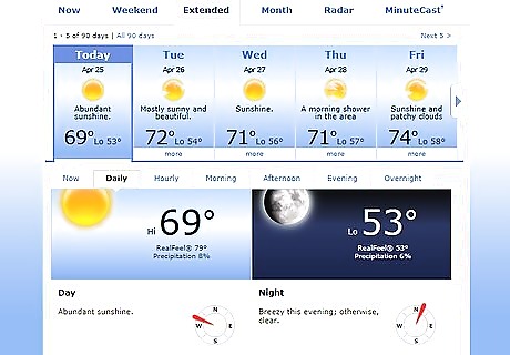 Confirm that the weather will be clear. In addition to checking the lunar calendar, you will need to check the weather forecast for the evening that you plan to view a meteor shower. Poor weather can easily put a damper on your meteor-viewing experience. The best conditions for watching meteor showers are dry and clear. If it is very cloudy, you may not be able to see any meteors. If it is raining or snowing, you will not only have a low chance of seeing any meteors, but you will also be extremely uncomfortable sitting outside.