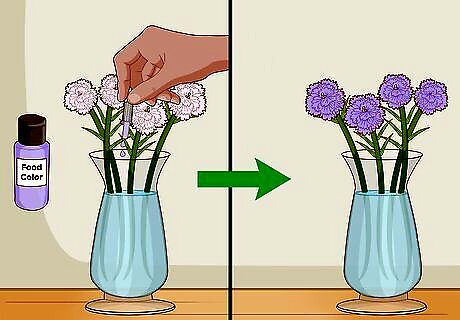 Use food coloring if you want to change the color of your carnations. This works best with white carnations, although you can do it with other colors as well. Simply add 10 to 20 drops of food coloring to the water in your vase. Within a day, the dye will spread as the carnation absorbs the water. For example, turn a white carnation red by adding red dye to the water.