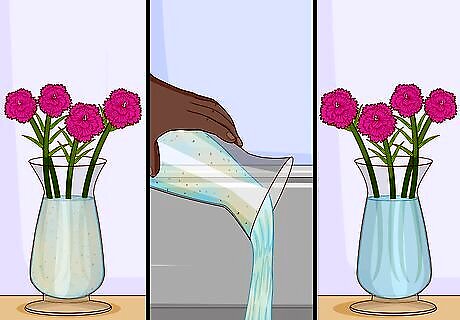 Choose a clean vase to store your carnations. Dirty vases have pathogens that can reduce your carnation's lifespan. Wash your vase out with dish soap and hot water first, and then rinse it very well to ensure all of the soap is gone. To avoid contamination, wash out the vase anytime you change out the water.