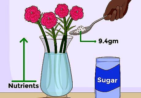 Add sugar to the water to preserve the flowers. Pour about 2 teaspoons, or .33 oz (9.4 g) of white sugar, into the vase. Remove your carnations before mixing the sugar into the water. Sugar adds nutrients for the plant to absorb, leading to longer-lasting carnations. If you don’t have white sugar, lemon-lime soda will also work. Another option is flower food purchased from a florist shop. Mix the plant food into the water according to the directions on the label.