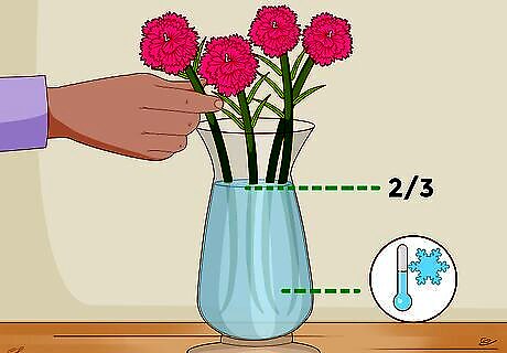 Fill the vase ⅔ full with cold water. Clean tap water is safe to use. After filling the vase, place the cut stems in the water, making sure no leaves are submerged. Room temperature water is also safe to use, although using cold water prevents air bubbles from blocking water absorption inside the stem. Warm water should be avoided since it causes flowers to fade faster.