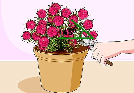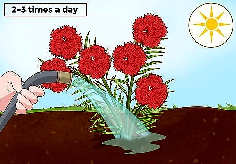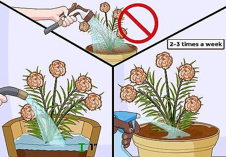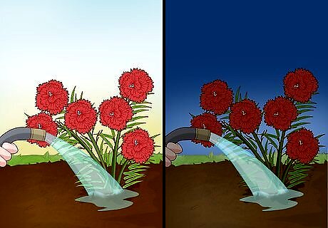 Provide water in the morning or at night. These are the best times to water the carnations because of the lower temperatures. Water added during the early morning hours has some time to soak in before the sun comes out. If you add water at night, the soil stays moist overnight. Night watering can be helpful if you find out that your soil dries too quickly during warmer months. Watering during the day is safe and should be done if your plant needs water right away.