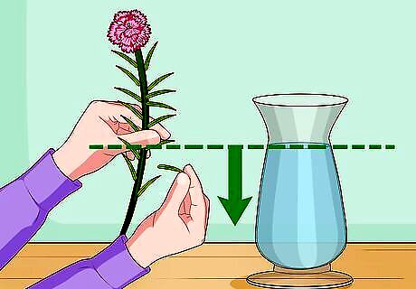 Remove any leaves that will be submerged in the water. Water exposure will cause these leaves to rot, so remove them ahead of time. You may only need to remove the lowest leaves, if you have to remove any at all. Pluck them or slice them off close to the stem. Many times, the stem is long enough to keep the leaves out of the water. You won't need to remove leaves if your flowers have long stems.