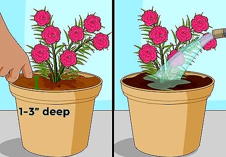 Test the soil's moisture before watering by pushing your thumb into it. If the soil feels moist and your thumb is able to easily pass through it, your carnations likely don't need to be watered. If you can’t push your thumb between 1 to 3 in (2.5 to 7.6 cm) into the soil, the soil is too dry and you should water your carnations. Carnations need little water, so waiting until the soil is almost completely dry prevents overwatering.