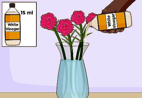Pour vinegar into the water to eliminate bacteria. Add about 2 tablespoons, or .5 fl oz (15 mL), of white or apple cider vinegar. Vinegar sterilizes the water, keeping your carnations fresh. Instead of using vinegar, you can pour several drops of any type of alcoholic spirit into the vase. If you use flower food, you do not need to add vinegar. The flower food will protect the plant from bacteria. You may also use 1 tsp (4.9 mL) of bleach if you don’t have any vinegar.