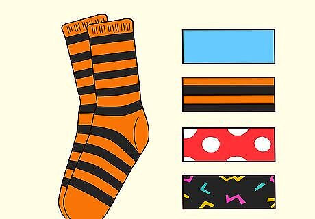 Choose socks with bright colors and fun patterns. To keep with your 80s theme, go for bright colors and wacky, geometrical patterns. You’ll also want to match your socks to the rest of your outfit. You can either buy socks to match an outfit you already have planned out, or work the rest of your outfit around a couple spectacular pairs of socks. Pick sock colors for a holiday theme, like orange and black for Halloween. You can also choose bright colors that offset each other, like bright blue and pink, or orange and purple. Pair socks with slightly different patterns, like stripes of different widths or smaller and larger polka dots. The 80s were all about fun, colorful clashes, so don’t be afraid to mix and match!