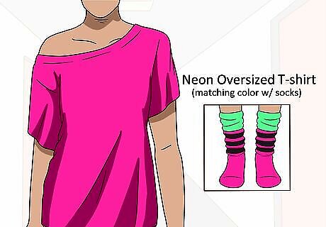 Pick a neon, oversized t-shirt. Make sure it matches your socks! Bonus points if your tee is off-the-shoulder. Go with bright, playful shades like pink, yellow or blue. Thick stripes or other patterns are fun, too!