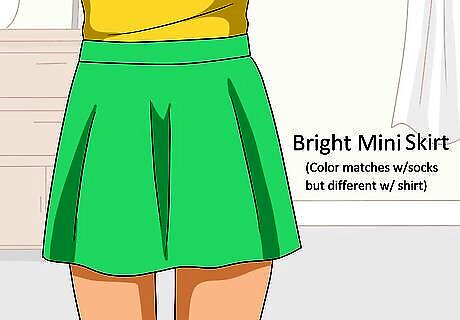 Choose a bright mini skirt for a flirty look. Mini skirts were all the rage in the 80s! Find a colorful or metallic-looking skirt to rock for your 80s outfit. The short length will emphasize your fun layered socks. Look for a skirt that matches one of the colors of your socks, but don’t get one in the same color as your shirt. Wear bright tights under the skirt to sport a more conservative look.