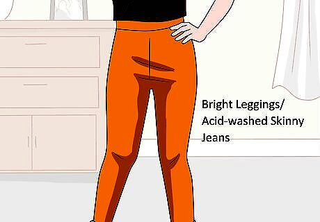 Slip on leggings or skinny jeans to look sporty and fun. Some bright leggings or acid-washed skinny jeans can also be the perfect addition to an 80s outfit. Pull your socks over the outside of the leggings to make sure they’re visible.