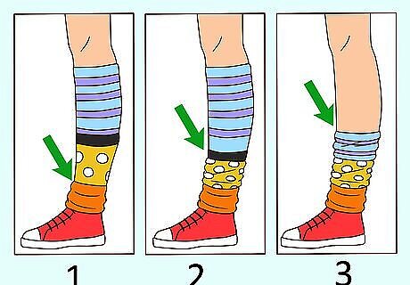 Scrunch down your socks. Starting with the shortest sock, push the top of the sock down towards your ankle so that just a few inches are showing above your shoe. Continue with the other one or two layers, always making sure that each layer is visible above the one below it. You want each sock layer to be visible, after all!