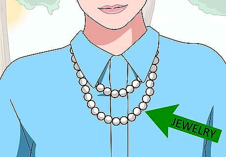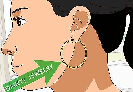Wear dainty jewelry. Instead of donning your pearls or stones, wear a simple gold chain, a statement ring, or pair of basic gold hoops. All of these will keep the outfit low-key instead of fancy or overwhelming. One of the most important parts of keeping jewelry simple is choosing a single piece to emphasize. Choose between a statement ring, a necklace, or a pair of earrings--not all three.